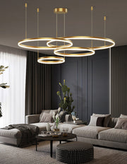 • Description: Golden LED chandelier featuring 4 large rings emitting warm white light