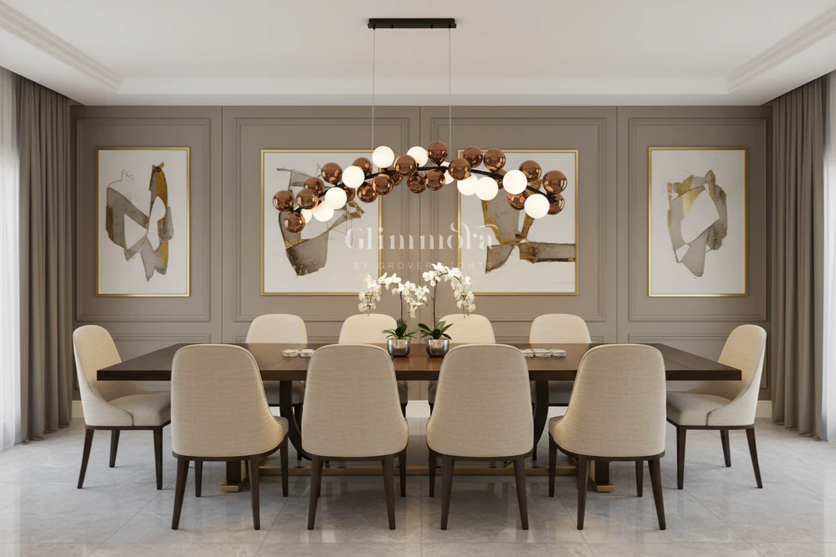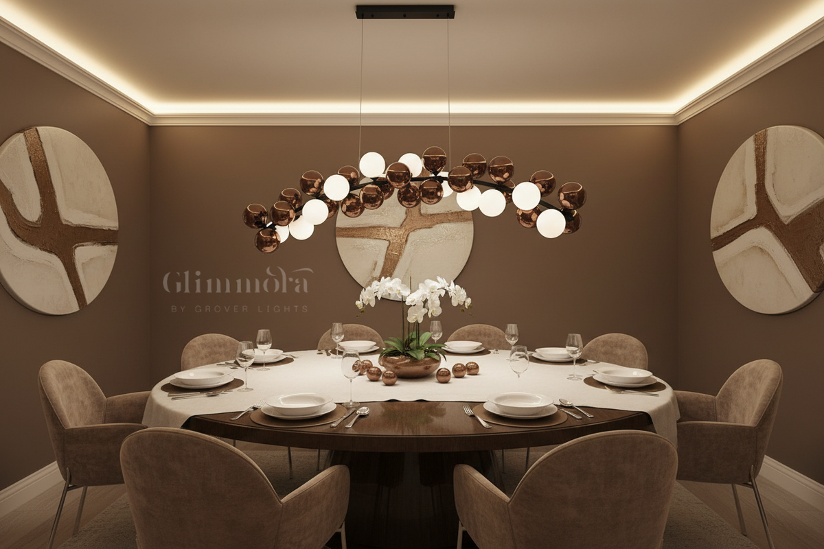 Fifteen white globes illuminate when fitted with bulbs, washing the space with a warm, polished glow. The remaining fifteen rose-gold spheres remain unlit by design—glossy and reflective—acting as the silent echoes that complete the visual rhythm. Together, they create a stunning balance of light and shadow, presence and poise.