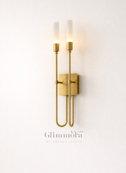 A minimalist wall light featuring two slim vertical frosted glass tubes mounted on refined brass stems, creating a clean and contemporary statement.