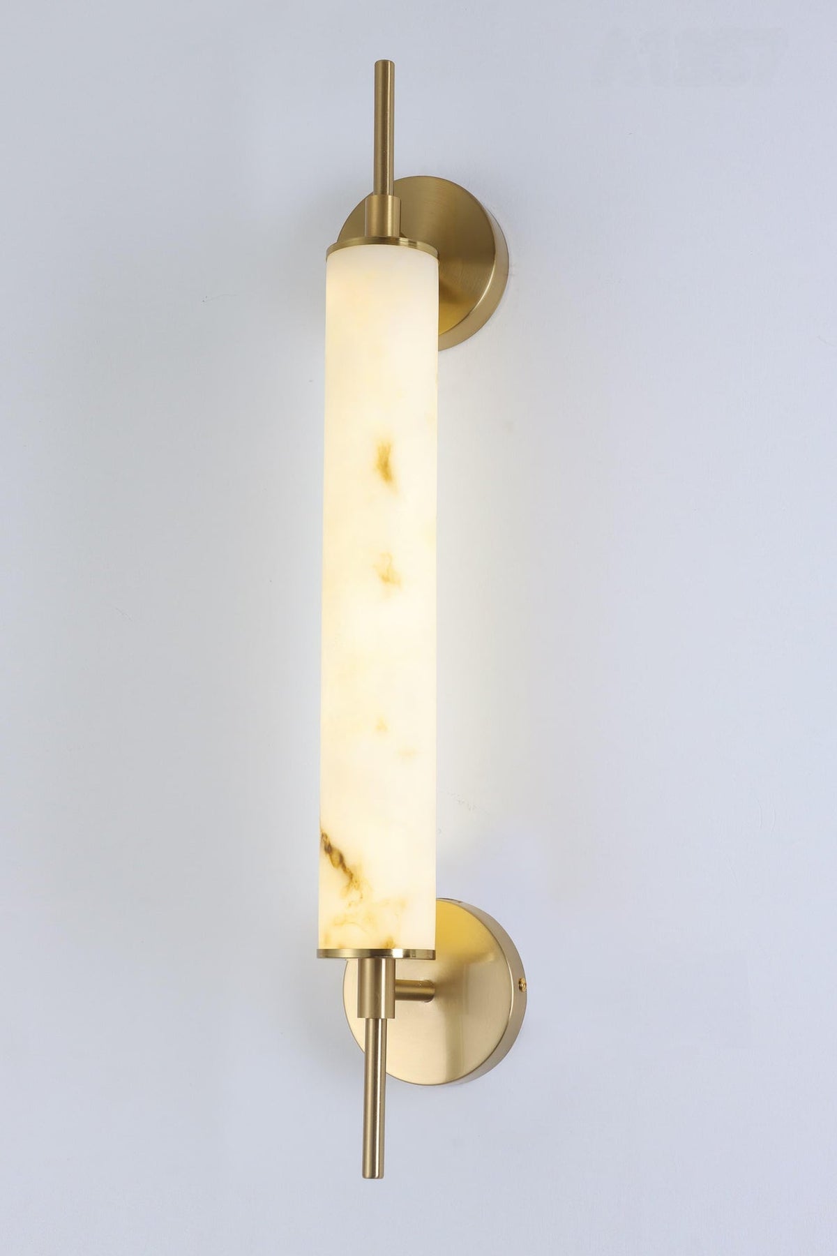 - Featuring a genuine alabaster column suspended between two brushed mounts, it provides a soft, diffused light perfect for creating a serene atmosphere in a bedroom, living room, or hallway.