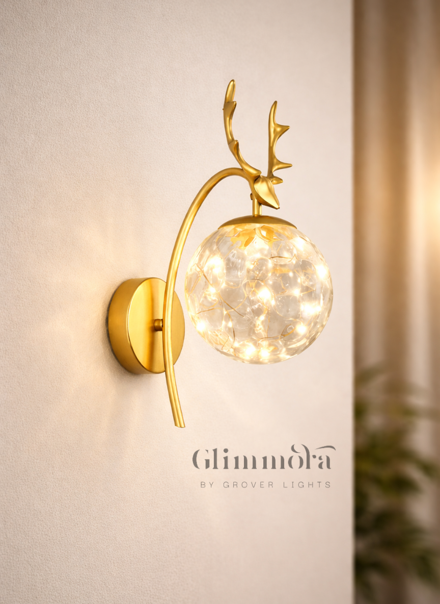 A sculptural wall light featuring an elegant brass deer head and antler motif, creating a bold statement piece inspired by nature and wildlife forms.